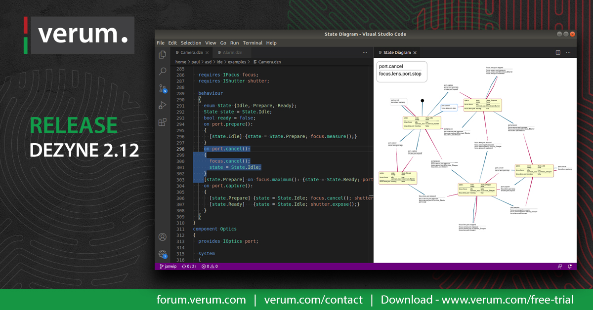 Verum is happy to announce Dezyne 2.12: This is the first release to include a complete state diagram for interfaces, components and systems. Dezyne introduces a new command to explore models (dzn explore ) that can generate an LTS in Aldebaran format a state diagram in DOT format for interfaces, components and systems. These additions are a big step forward in helping to explore and understand the complex behavior of the system that is under development.
